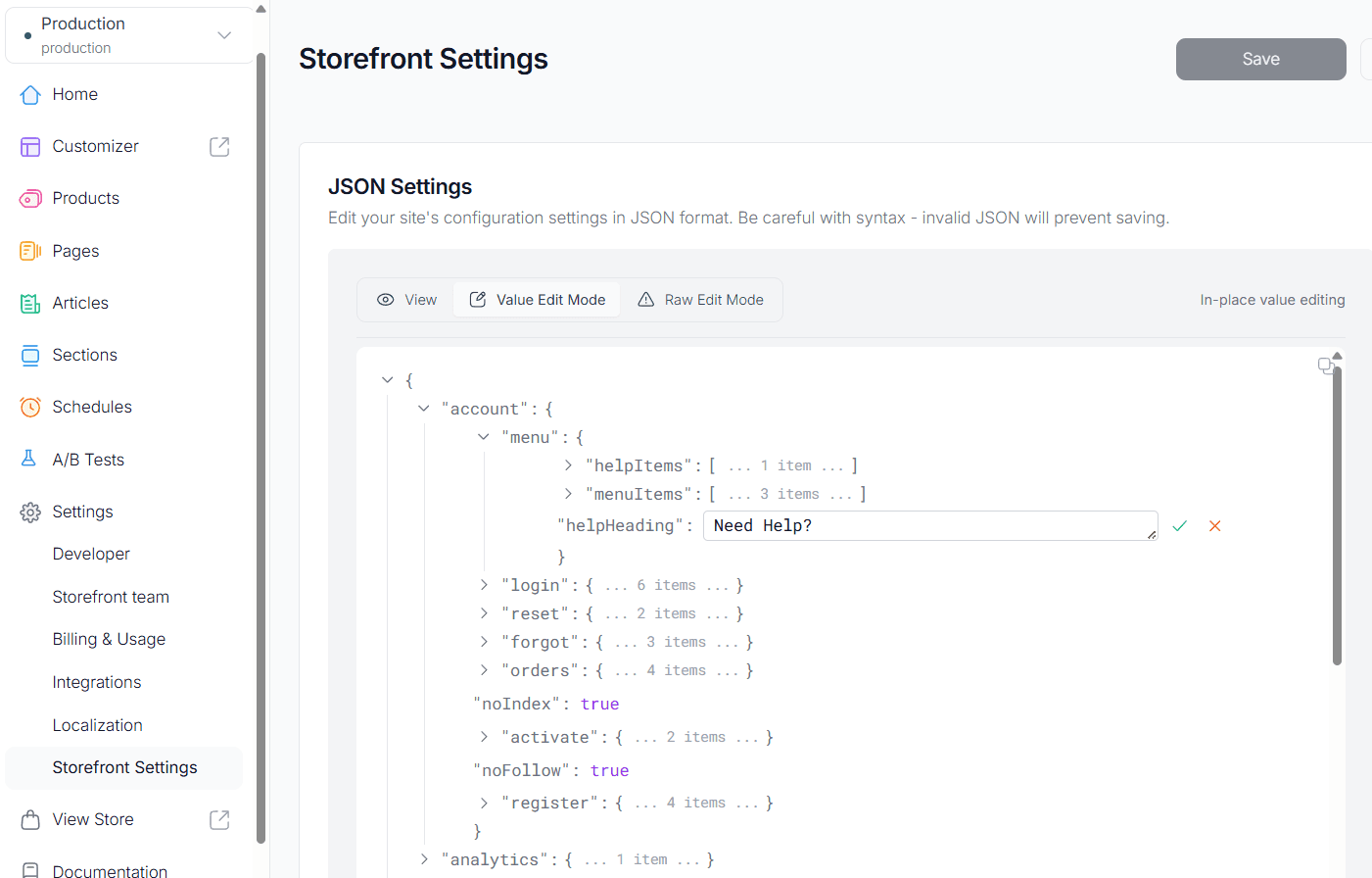 Go to Pack Admin → Settings → Storefront Settings to view and edit your storefront’s configuration in JSON format.