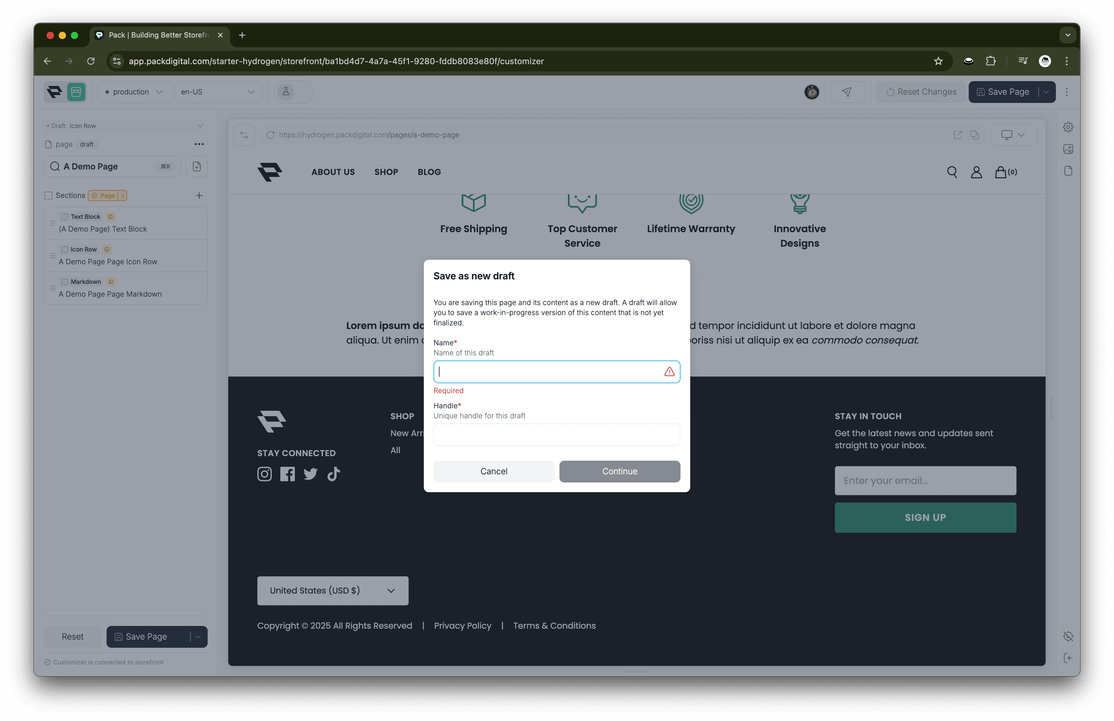 Page Drafts enable you to create and maintain different versions of a page for testing, feedback, or review purposes. Each draft is a separate version of the page that can be modified independently of others. This is particularly useful when:
