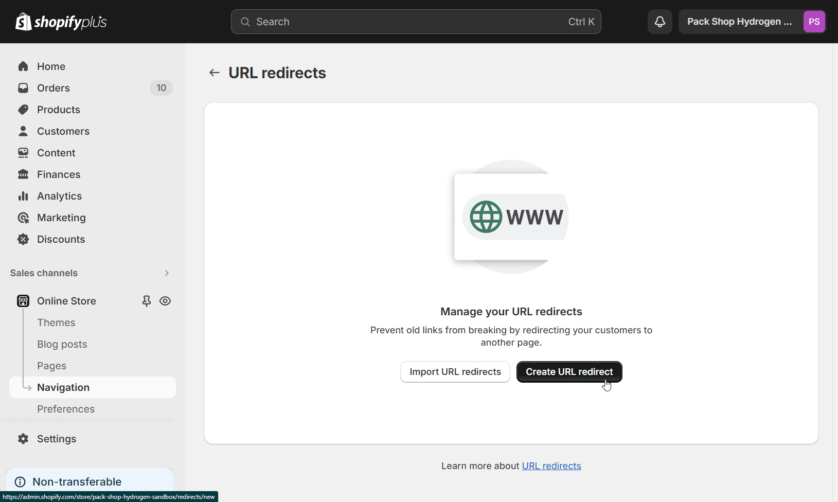 - Click on 'Create URL Redirect' or 'Import URL Redirects'.