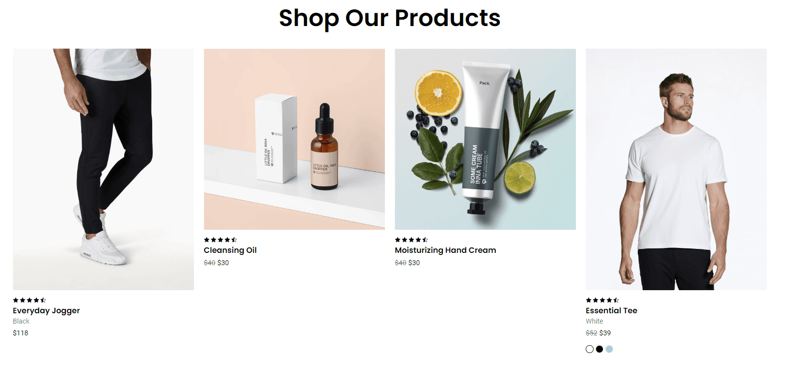 The Products Grid section displays a grid of products that are fetched dynamically based on their handles. This section allows you to showcase a collection of products in a customizable grid layout with options for star ratings and other product details.