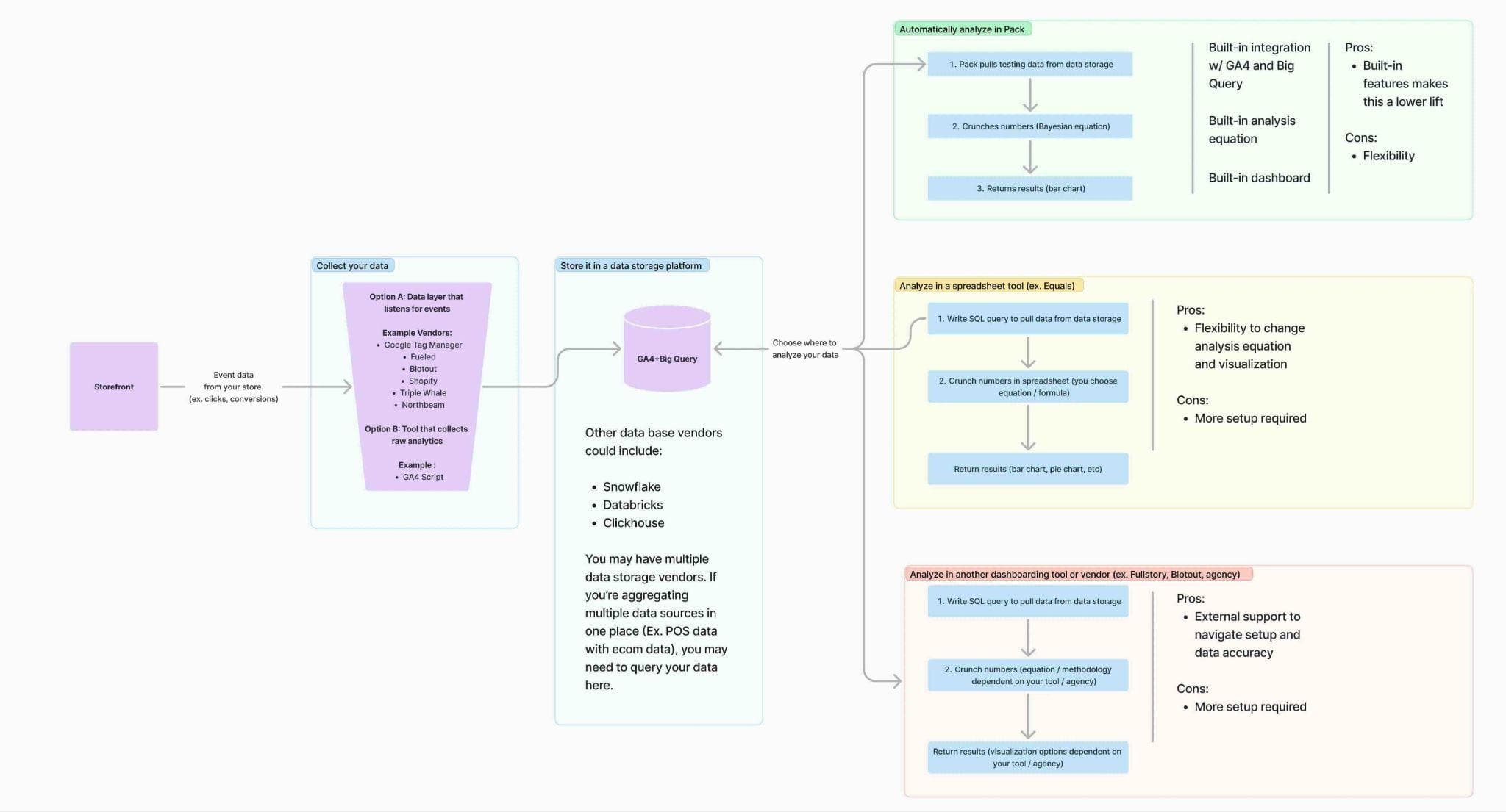 Your storefront data (including your A/B testing events) are stored in a database, such as GA4, Big Query, Snowflake, Databricks, or Clickhouse. You may have multiple data storage vendors. If you’re aggregating multiple data sources in one place (Ex. POS data with ecom data), you may need to query your data here.