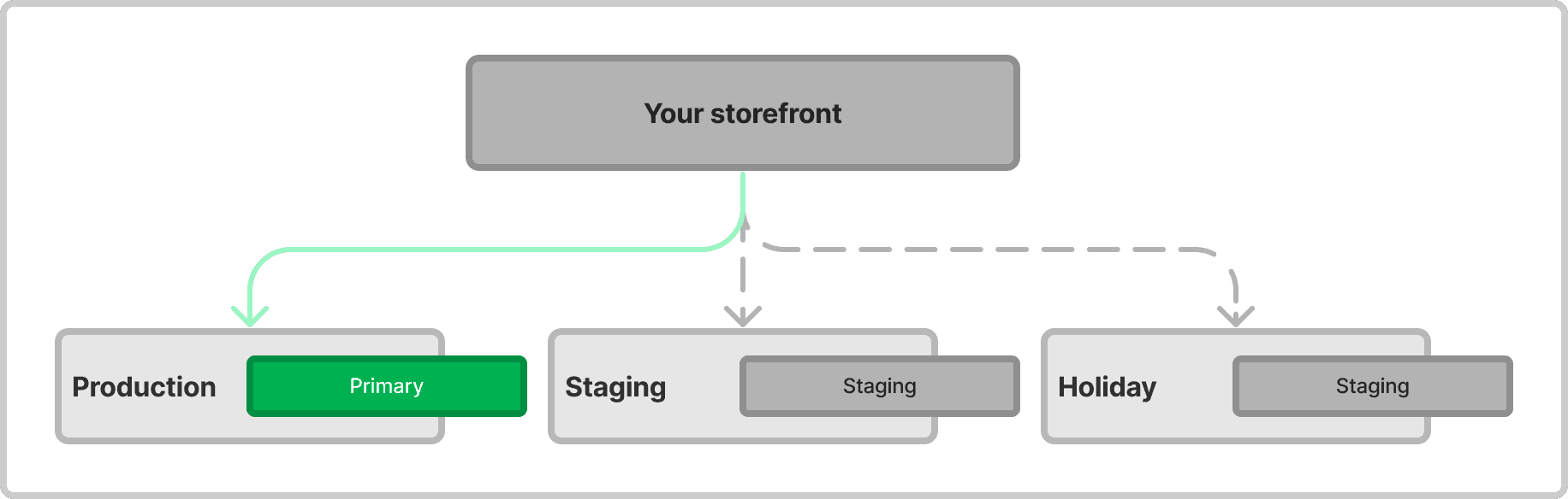 By default, every storefront has one default content environment known as the primary environment. Your primary environment is the one that is used for content on your storefront, unless otherwise specified.